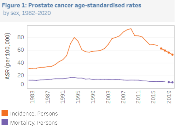 Figure 1. Trends of prostate cancer incidence and mortality in Australian men 1982-2020, rate per 100,000 men
