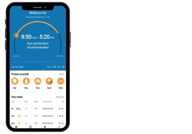 Daily sun protection times (the times when the UV Index is forecast to reach 3 or above) for locations across Australia can be accessed via the free SunSmart app (for iPhone and Android phones and tablets), the SunSmart or Bureau of Meteorology websites and in daily newspapers. Real time UV levels for Australian capital cities can also be accessed via the app and at Australian Radiation Protection and Nuclear Safety Agency