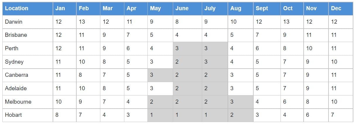 Table 1: Australian capital city average daily maximum UV levels by month.[15]