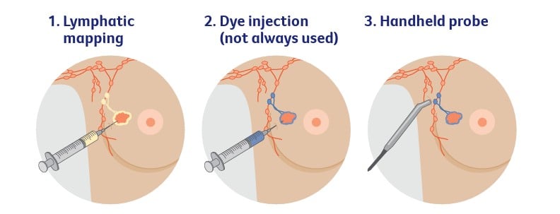 As well as looking at where the dye travels to first (if used), the surgeon uses a small handheld device called a probe during the surgery to detect the radioactive solution injected during the lymphatic mapping.