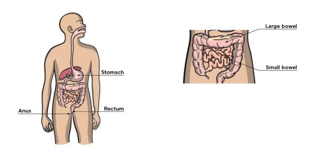 The bowel connects your stomach to your rectum where waste material (poo) is stored until passed out from the anus (bum).
