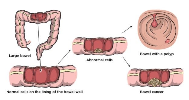 Bowel cancer develops from the inner lining of the bowel and is usually preceded by growths called polyps. These can become invasive cancer if undetected.