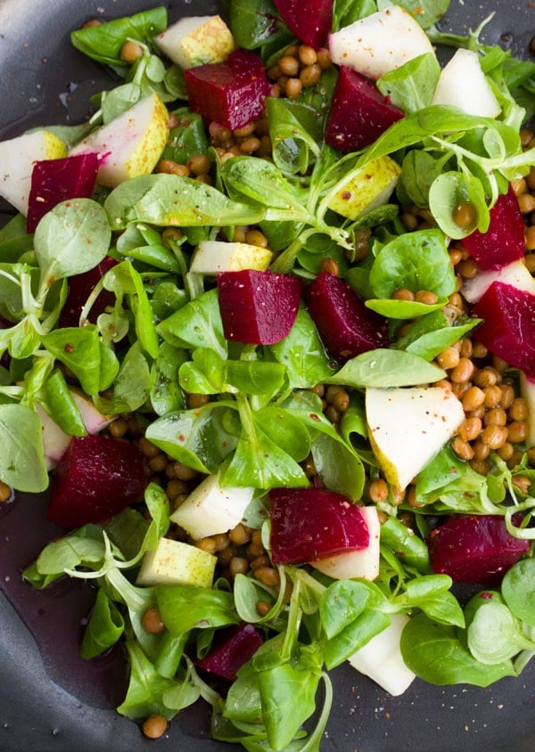 - Place lentils, baby beets and spinach or rocket leaves in a large bowl.