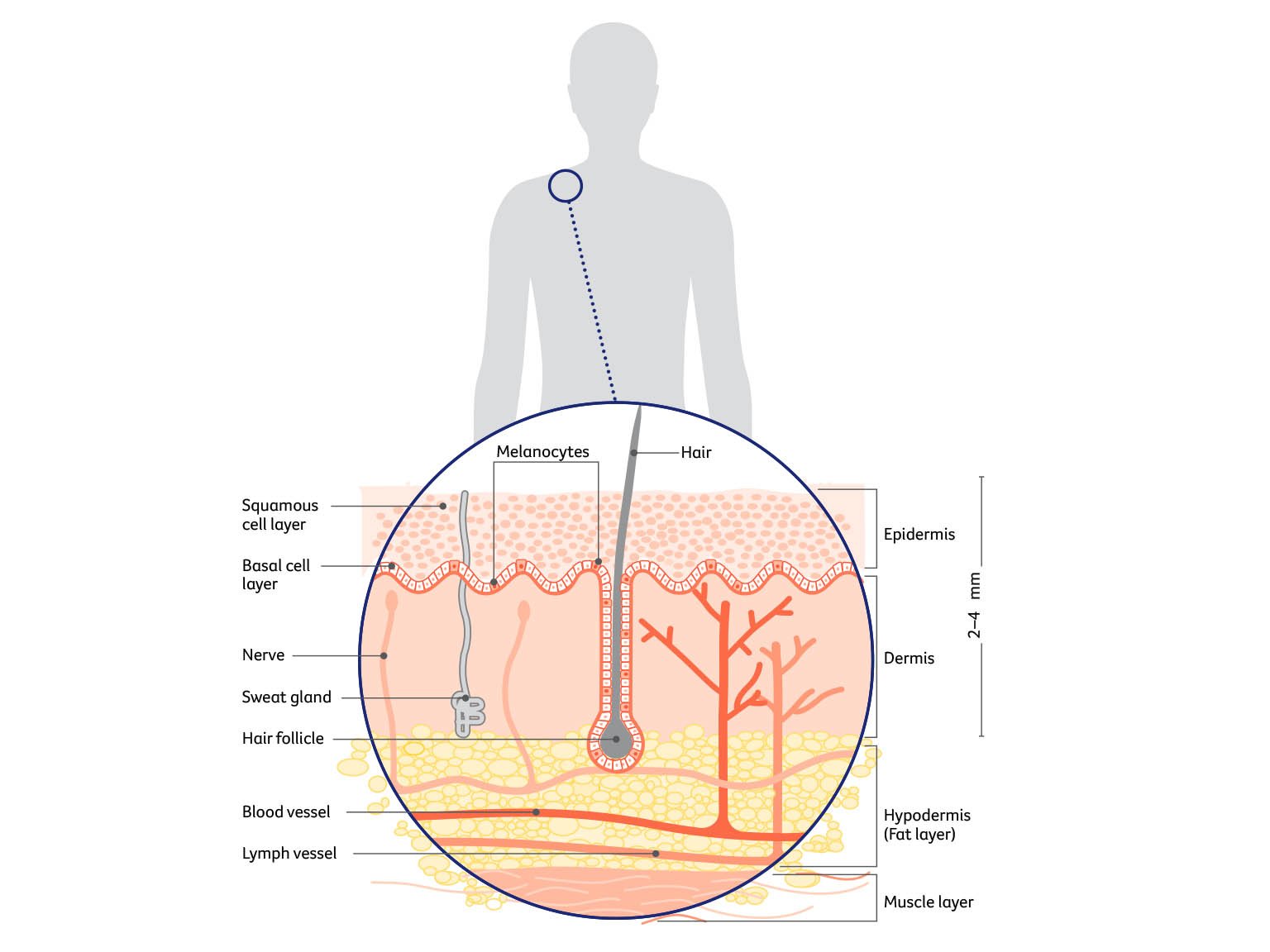 The skin is the largest organ of the body. It acts as a barrier to protect the body from injury, control body temperature and prevent loss of body fluids. The 2 main layers of the skin are the epidermis and dermis.